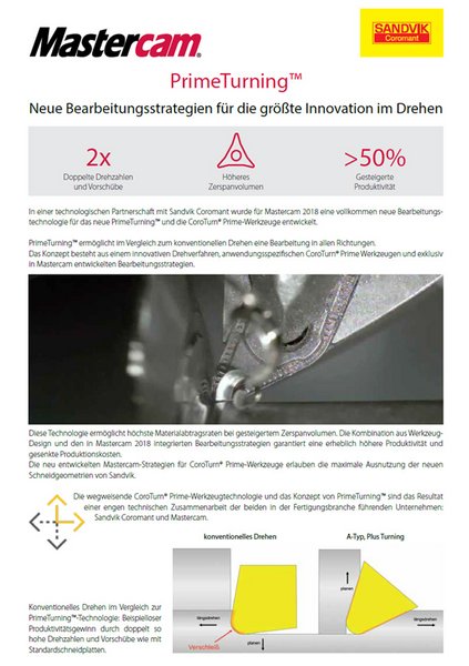 PrimeTurningTM ermöglicht im Vergleich zum konventionellen Drehen eine Bearbeitung in alle Richtungen. Das Konzept besteht aus einem innovativen Drehverfahren, anwendungsspezifischen CoroTurn Prime-Werkzeugen und exklusiv in Mastercam entwickelten Bearbeitungsstrategien.