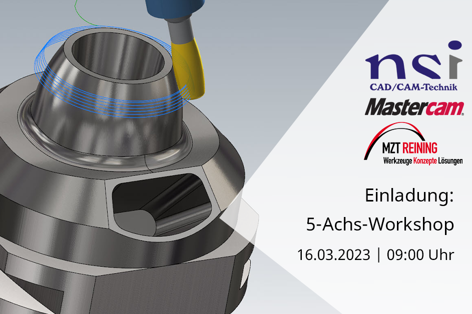 Nutzen Sie die Möglichkeit, die simultane 5-Achsen Programmierung mit Mastercam 2023 unverbindlich kennen zu lernen, in den Austausch mit Experten zu kommen und um frische Ideen für Ihre Fertigung zu erhalten. Unser Vertriebspartner NSI CAD/CAM Technik GmbH lädt Sie kostenlos ein.