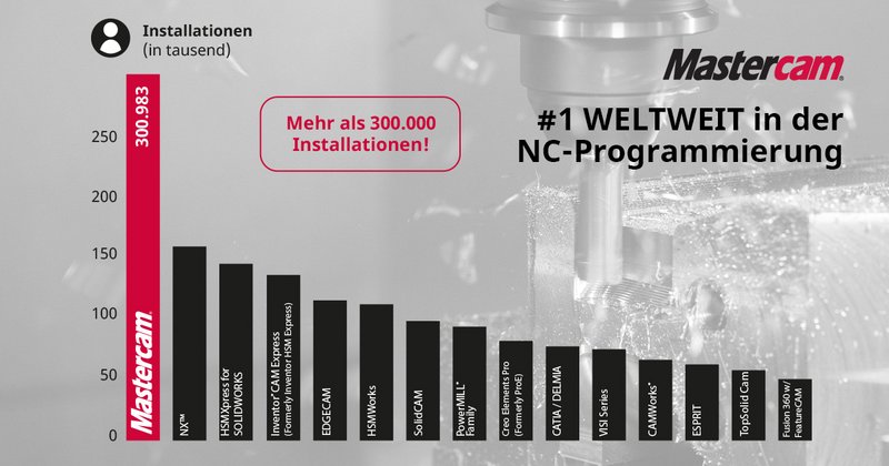 Das unabhängige Forschungsunternehmen CIMdata bestätigt: Mit mehr als 300.000 Installationen ist Mastercam das 28. Mal in Folge die am meisten genutzte CAM-Software weltweit. Das modular aufgebaute CAD/CAM-System überzeugt seit mehreren Jahrzehnten Unternehmen aus verschiedenen Branchen. Ob Raumfahrt-, Medizin- oder Schwerindustrie: Mastercam bietet die perfekte Lösung für alle industriellen Bereiche und wird für die Herstellung verschiedenster Bauteile aus unterschiedlichsten Materialien verwendet.